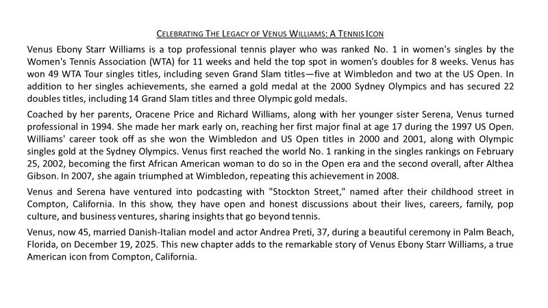 VENUS WILLIAMS Related Articles CRESSEY PARK BASEBALL LEONARD ‘LENNY’ RANDLE BOBBY JONES, JR. DeMAR DeROZAN